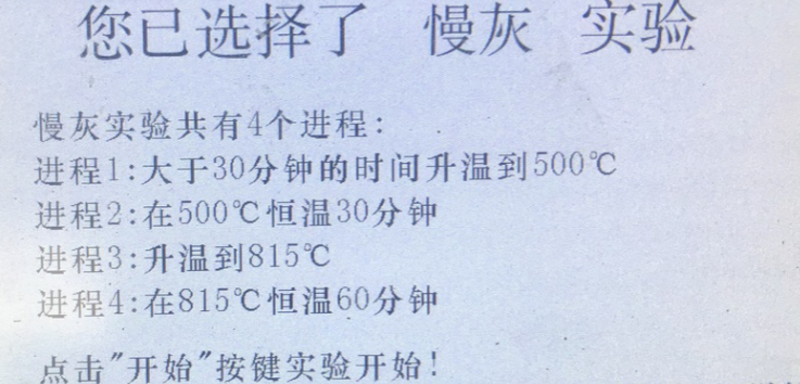 打開灰揮測定儀主界面選擇慢灰實驗,進入慢灰實驗界面。待爐溫小于100℃,打開爐門將裝有煤樣的灰皿(分析煤樣重量:1±0.1g)送入爐內恒溫區,打開煙筒,關閉爐門且安裝灰份座(使爐門保留15mm縫隙),點擊開始按鈕。進程顯示“1”,爐內溫度開始慢慢上升。當溫度到達499℃后自動進入進程2,在500℃恒溫30min。時間到后自動進入進程3,爐溫繼續從500℃升到815℃。溫度達到后自動進入進程4,在815℃溫度下恒溫1h,時間滿足后,慢灰實驗結束,蜂鳴器智能提醒,點擊結束按鈕,結束本次實驗。打開爐門將試樣平穩取出。